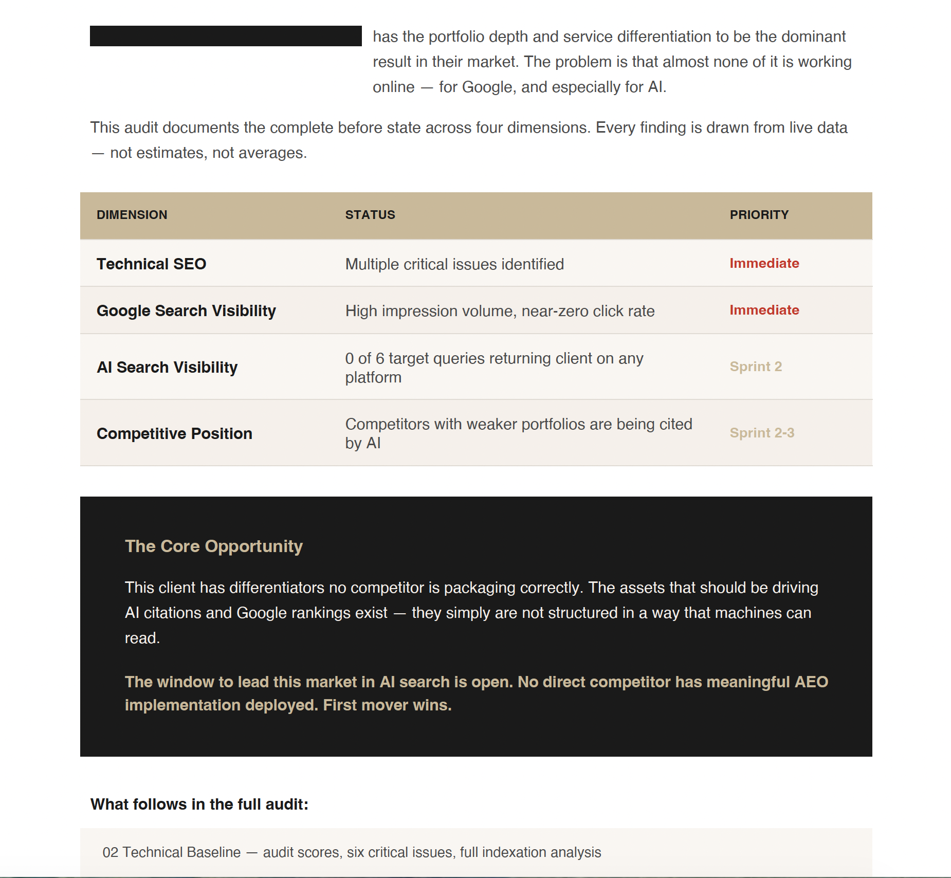 A custom AEO and SEO audit that shows you exactly how to get your name cited by ChatGPT, Perplexity, and Gemini before your competitors know this exists.